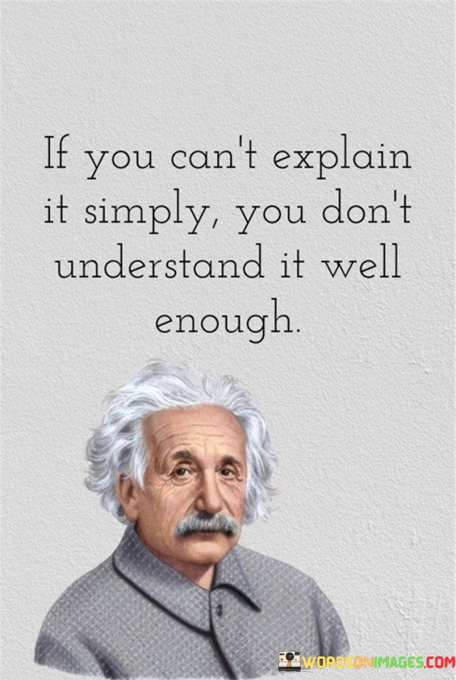 The statement "If you can't explain it simply, you don't understand it well enough" underscores the importance of clear understanding and effective communication. It implies that true mastery of a subject or concept is demonstrated when one can convey it in simple terms that others can easily comprehend. When we truly understand a concept, we can break it down into its fundamental elements and convey it in a way that is accessible to others, regardless of their level of knowledge on the topic. This ability to simplify complex ideas showcases a deep understanding of the subject matter. On the other hand, if we struggle to explain a concept in a straightforward manner, it may indicate gaps in our comprehension. It suggests that we may still have uncertainties or incomplete knowledge about the subject. Clear and concise explanations are essential for effective communication and knowledge-sharing. When we can express complex ideas in simple language, we make information more accessible and facilitate learning and understanding for others. Moreover, the ability to explain a topic simply benefits the speaker as well. It forces us to clarify our own thoughts, organize information, and identify any areas where our understanding may be lacking. By seeking simplicity in our explanations, we refine our comprehension and deepen our knowledge. The concept behind this statement is applicable in various fields, including education, science, business, and everyday interactions. It encourages us to strive for clarity in our communication and to continuously seek a deeper understanding of the subjects we engage with.