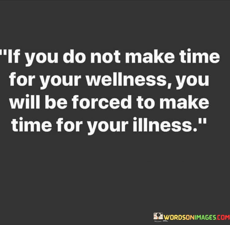 Certainly! This quote is about the importance of taking care of yourself. In the first paragraph, it explains that if you don't set aside time to focus on your well-being, you might end up having to deal with illness later on. It's like saying that if you don't take steps to keep yourself healthy, you might have to deal with being sick instead.
