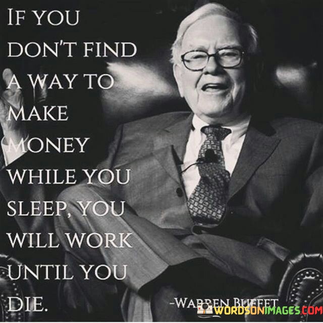The quote "If you don't find a way to make money while you sleep, you will work until you die" carries a profound message about the importance of creating passive income streams and financial independence. It highlights the critical distinction between active income, which requires constant effort and time, and passive income, which continues to generate revenue even when an individual is not actively working. The quote emphasizes the significance of financial planning and building wealth through investments, entrepreneurship, or other sources of passive income. Relying solely on a traditional 9-to-5 job may not provide the financial security needed for the long term. Without passive income, individuals may find themselves continuously working and dependent on active income well into their retirement years. By generating passive income, individuals can achieve financial freedom and reduce their reliance on traditional employment. Passive income sources can include investments in stocks, real estate, or businesses, as well as royalties from books, music, or digital products. Such income streams continue to generate revenue with little to no effort from the individual, allowing them to enjoy a more flexible and fulfilling lifestyle. The quote also underscores the importance of financial literacy and smart money management. Understanding how to invest, save, and grow wealth is crucial for creating passive income streams. By making informed financial decisions and cultivating a long-term vision, individuals can create a solid foundation for their financial future. Moreover, the quote encourages individuals to think beyond the confines of a paycheck-to-paycheck existence. It challenges the traditional notion of working solely for a salary and instead promotes the idea of building assets and creating lasting financial security. In conclusion, the quote "If you don't find a way to make money while you sleep, you will work until you die" highlights the significance of passive income in achieving financial independence and security. It stresses the importance of creating income streams that continue to generate revenue even without active effort. By prioritizing financial planning, investing, and smart money management, individuals can break free from the cycle of working solely for a paycheck and instead build a pathway to financial freedom. Investing in passive income sources allows individuals to enjoy a more balanced and fulfilling life, free from the constraints of a lifetime of work.