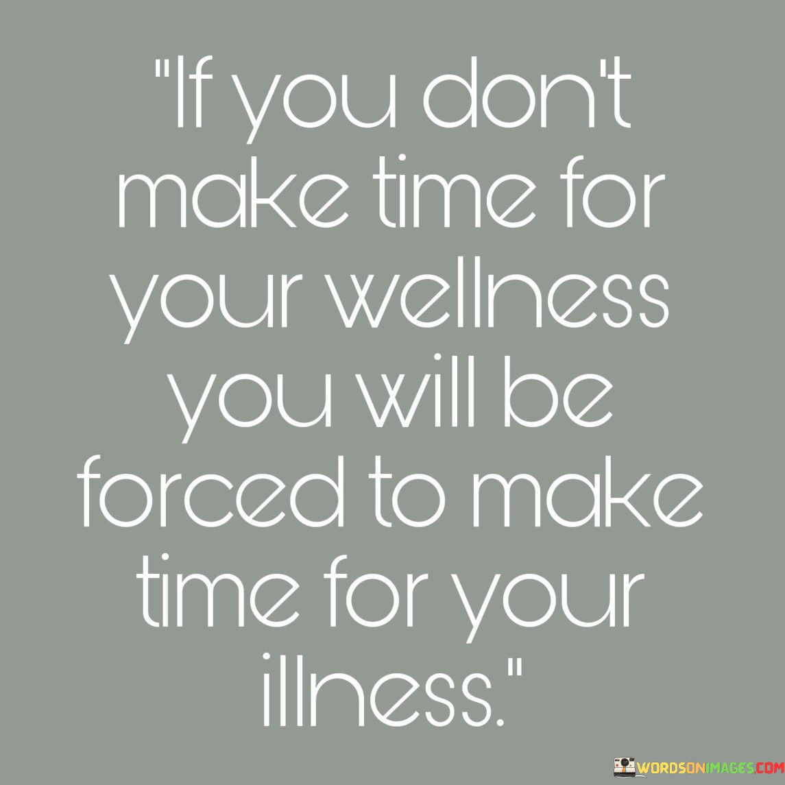 This phrase underscores the importance of self-care. "If You Don't Make Time For Your Wellness" emphasizes the need for proactive well-being efforts. "You Will Be Forced To Make Time For Your Illness" suggests that neglecting self-care may lead to health issues requiring more time and attention later.
