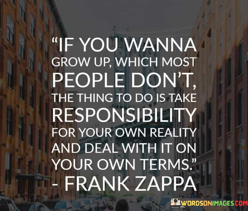 The quote "if you wanna grow up, which most people don't, the thing to do is take responsibility for your own reality and deal with it on your own terms" emphasizes personal accountability and maturity. It suggests that genuine adulthood involves facing life's challenges independently and on one's own terms.