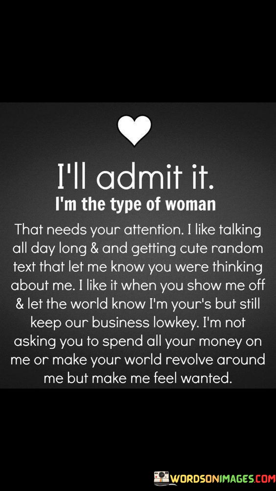 The statement portrays a woman who is open about her desire for attention and communication in a relationship. She appreciates frequent conversations and sweet, unexpected texts that make her feel cherished and remembered. Being shown off by her partner gives her a sense of pride and security in their commitment. However, she also values discretion and prefers to keep certain aspects of their relationship private, striking a balance between sharing their connection with the world and maintaining intimacy.