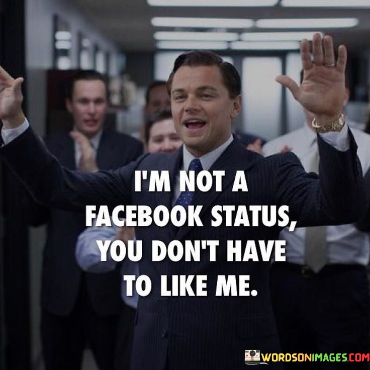 The quote asserts personal authenticity and self-worth. The phrase "I am not a Facebook status" metaphorically suggests that the speaker isn't seeking validation or approval like a social media post.