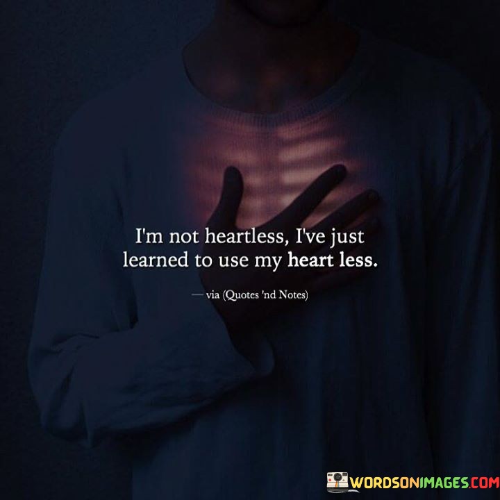The quote conveys a lesson in emotional self-preservation. "Not heartless" signifies retained empathy. "Use my heart less" implies guardedness. The quote conveys the idea of protecting oneself from emotional hurt by being more cautious in trusting and giving one's heart.