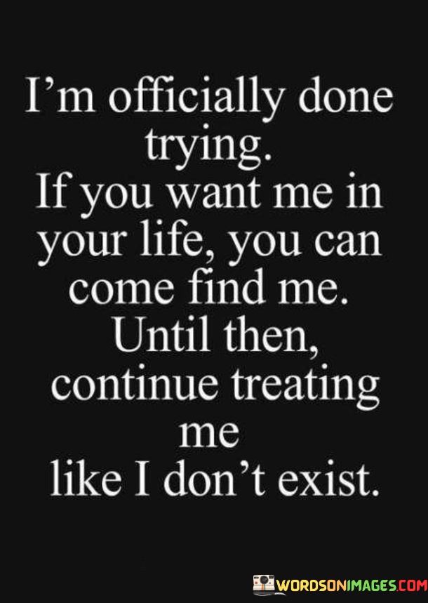 This quote conveys a firm decision to stop investing effort in a relationship where the other person isn't reciprocating or valuing the speaker's presence. It implies that the speaker is taking a step back and leaving the responsibility of initiating contact to the other person.