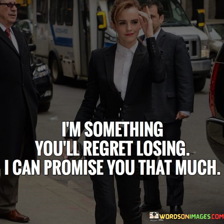 The quote underscores self-assuredness and value. "I am something you'll regret losing" conveys the speaker's confidence in their significance.