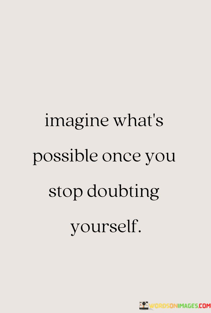 Imagination and self-belief go hand in hand. When you cease doubting yourself, you gain the confidence to dream bigger and aim higher. This quote encourages us to envision the accomplishments and goals that become feasible once we shed our doubts. It serves as a motivation to recognize the potential within and to pursue our aspirations with conviction. In essence, this quote is an invitation to free ourselves from the limitations of self-doubt and imagine the remarkable feats that become possible when we believe in ourselves.