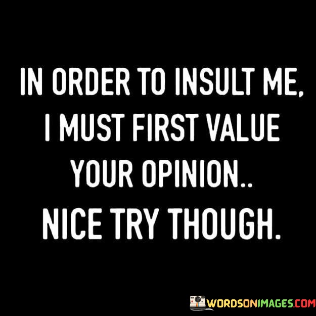 The quote reflects on the dynamics of personal value and criticism. "In order to insult me" implies an attempt to provoke a reaction. "Must first value your opinion" suggests the need for personal significance. The quote conveys that for an insult to affect the speaker, the opinion of the insulter must hold weight.