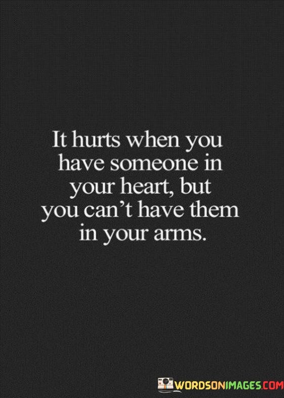 This quote succinctly captures the emotional pain of having feelings for someone you can't be with physically. It suggests that while you may have strong emotions for that person, external circumstances or factors prevent you from being together.