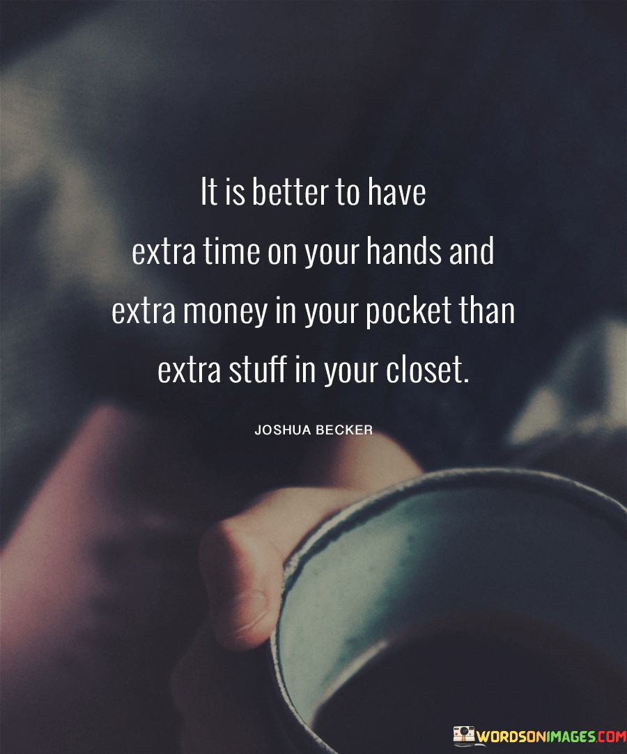 In essence, the statement emphasizes the significance of a balanced and meaningful life. "It Is Better To Have Extra Time On Your Hands And Extra Stuff In Your Closet" encourages individuals to prioritize time well-spent and relationships, recognizing that material possessions are secondary to enriching experiences.