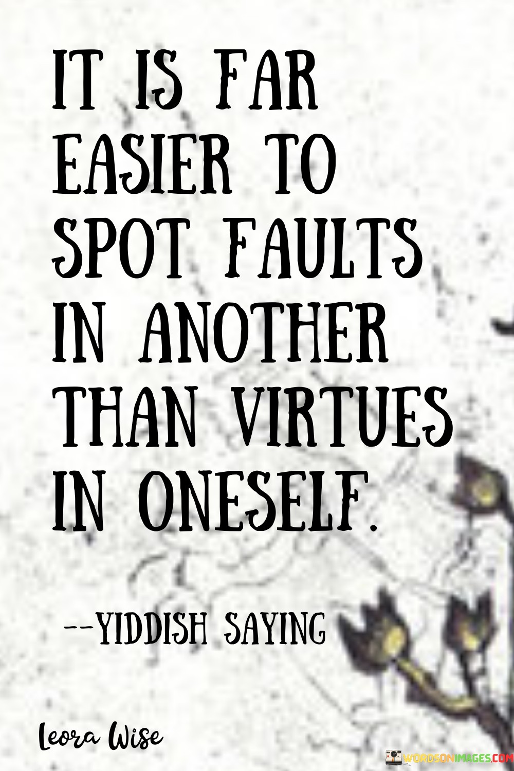 This quote reflects human tendencies in perception and self-awareness. In the first paragraph, it suggests that it's natural to notice flaws in others more readily than recognizing our own strengths. This could stem from bias, comparison, or a tendency to focus on negatives.