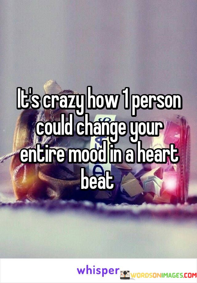 The quote illustrates the power of influence on emotions. "1 person could change your entire mood" signifies a significant impact. "In a heartbeat" implies swift transformation. The quote conveys the remarkable ability of someone's presence to alter feelings instantaneously.