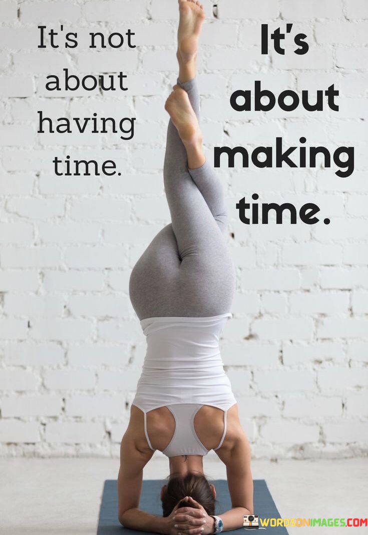 The quote "It's Not About Having Time, It's About Making Time" encapsulates a profound perspective on time management and prioritization. In this concise adage, the emphasis shifts from passively possessing time to actively creating it. The first paragraph delves into the essence of the quote, highlighting the fundamental distinction between having and making time. It underscores the idea that time, as a finite resource, cannot be increased, but its utilization can be optimized through intentional allocation.