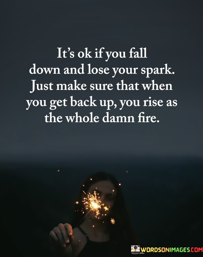 This quote encourages resilience. "It's ok if you fall down" acknowledges setbacks. "Lose your spark" implies a temporary setback. "When you get back up" alludes to recovery. It emphasizes the importance of not letting failure define you, but instead using it as a catalyst for a stronger comeback.