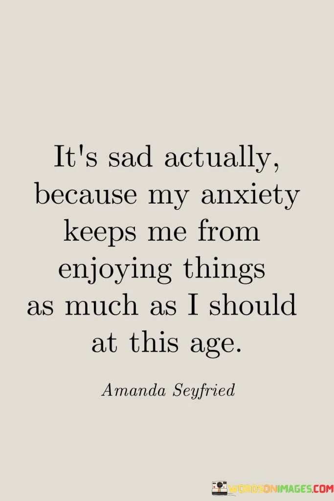 The quote reflects on the impact of anxiety on one's enjoyment of life. "Anxiety keeps me from enjoying things" conveys a sense of limitation. "As much as I should at this age" signifies missed opportunities. The quote highlights the emotional toll of anxiety on the speaker's life and experiences.