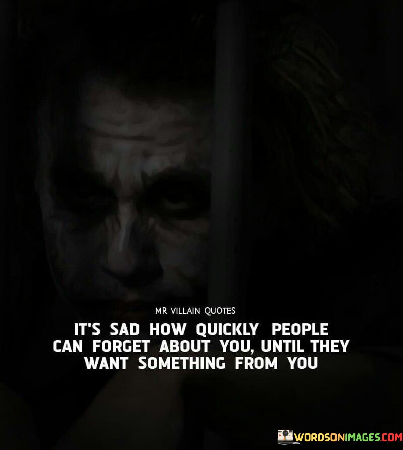 In the first 50-word paragraph, this quote highlights the bittersweet aspect of human relationships. It expresses a sense of sadness at how swiftly people can forget about someone when they no longer serve a purpose or offer something valuable. This observation underscores the often transactional nature of social connections.
