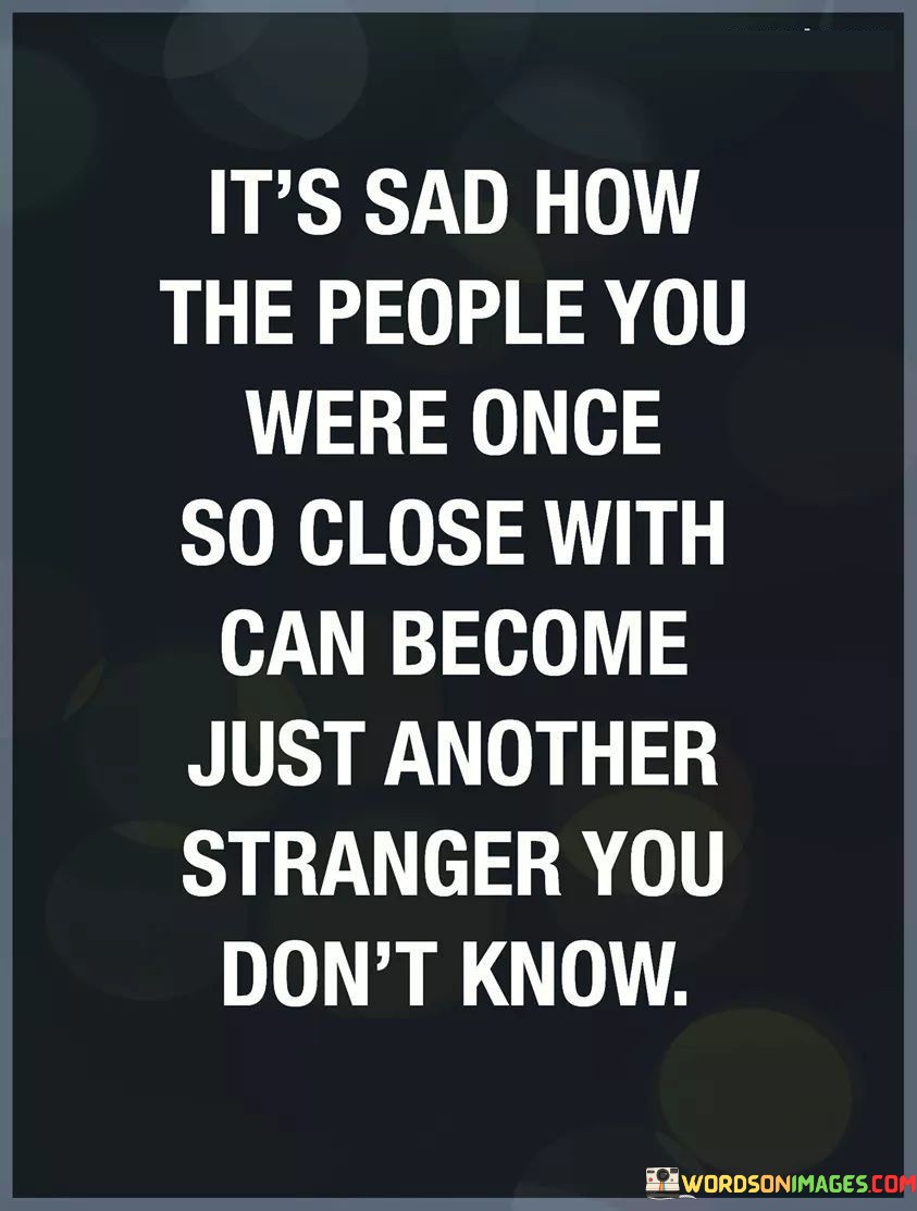 The quote reflects on the evolving nature of relationships. "People you were once so close with" alludes to past connections. "Just another stranger you don't know" signifies distance. The quote conveys the melancholy of growing apart from individuals who were once significant.