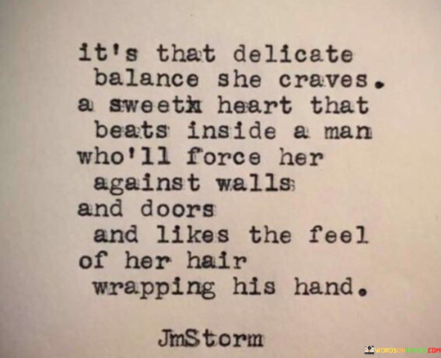 This provocative quote delves into a woman's desire for a specific type of passionate and intense relationship. "It's That Delicate Balance She Craves" suggests that the woman seeks a balance between tenderness and intensity in her romantic interactions. She desires a connection that is both gentle and fierce, where emotions run deep, and intimacy is profound.