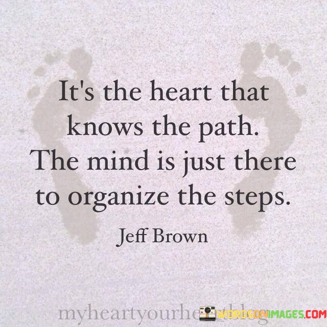 The quote "It's the heart that knows the path, the mind is just there to organize the steps" underscores the significance of intuition and emotional guidance in navigating life's journey. It suggests that while the mind plays a role in planning and execution, the heart holds the deeper understanding of purpose and direction.