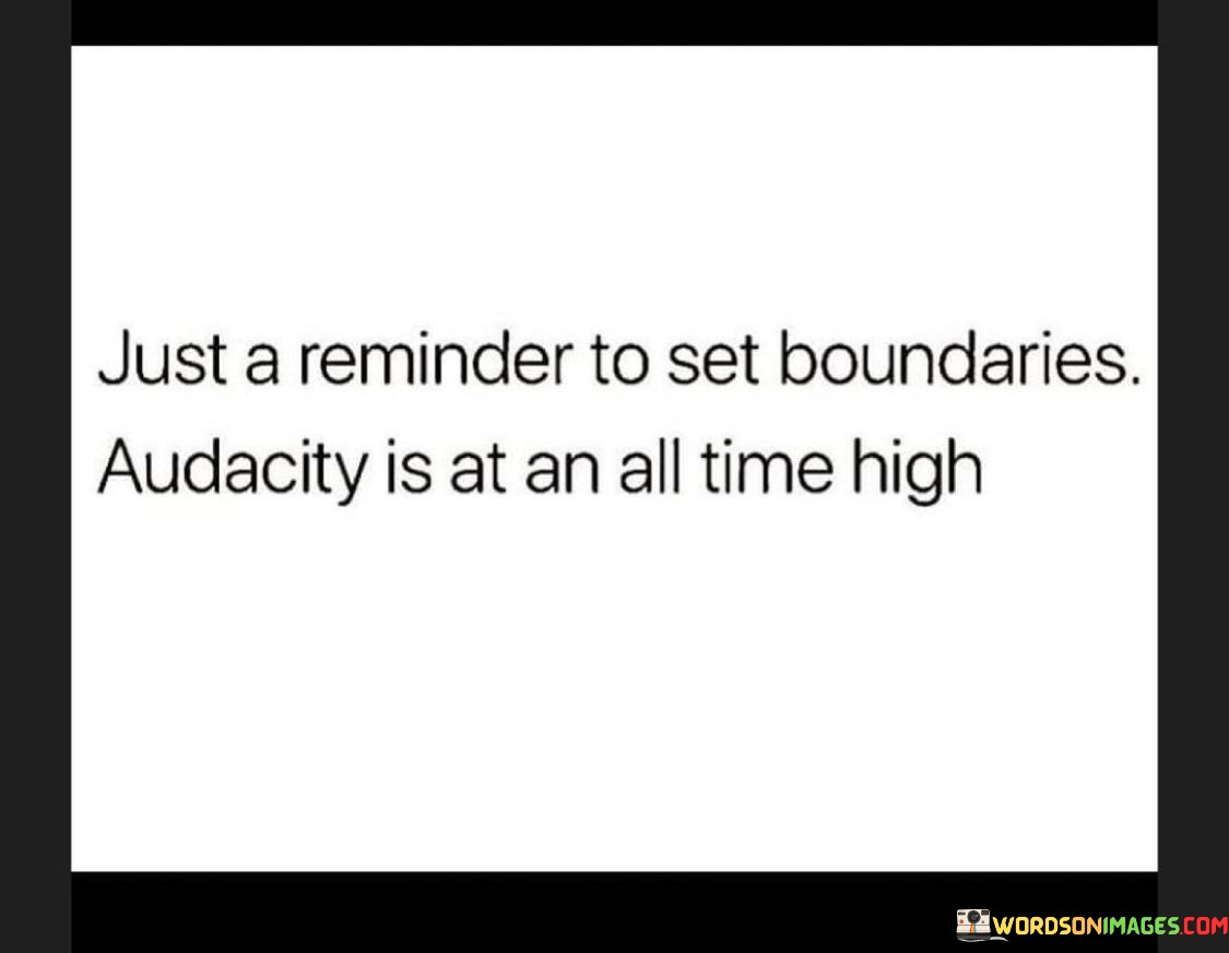 This statement serves as a reminder to establish personal limits. "Just a Reminder to Set Boundaries" encourages defining one's own limits. "Audacity Is at an All Time High" acknowledges a notable increase in bold or inappropriate behavior.