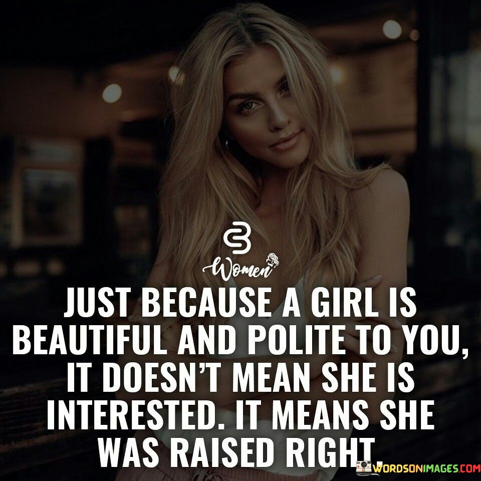 The quote "Just because a girl is beautiful and polite to you, it doesn't mean she is interested; it means she was raised right" sheds light on the misconception that politeness and attractiveness from a woman automatically indicate romantic interest. Instead, the quote emphasizes that these qualities are a reflection of her upbringing and values, highlighting the importance of courtesy and respect in her character. Politeness is a virtue instilled in individuals who were raised with good manners and taught to treat others with kindness and consideration. Similarly, beauty, in this context, transcends physical appearance and pertains to the inner grace and dignity she embodies. The quote challenges the tendency to misinterpret or assume romantic intentions based on superficial attributes, emphasizing the significance of understanding and appreciating a person's character beyond face value. It serves as a reminder to approach interactions with women with respect, acknowledging that their kindness and demeanor are not always signals of romantic interest but rather a reflection of their upbringing and values. By recognizing the importance of politeness and beauty as qualities that originate from good values and manners, the quote promotes a culture of mutual respect and appreciation for the uniqueness of individuals beyond any preconceived notions of attraction. Ultimately, it encourages genuine connections based on understanding, kindness, and consideration, rather than assumptions driven by appearances alone.