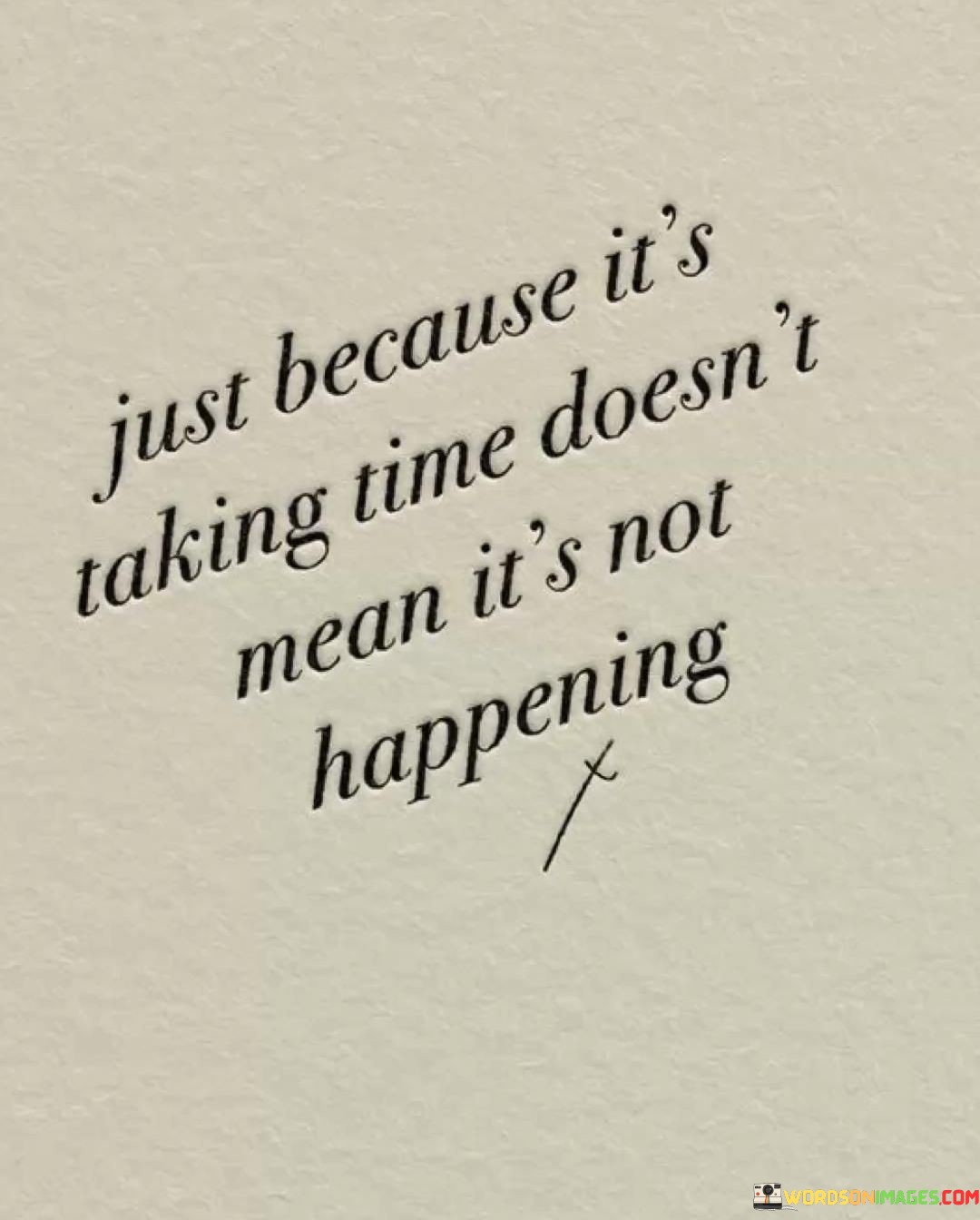 The statement promotes faith in the process. "Just Because It's Taking Time" underscores the importance of endurance. "Doesn't Mean It's Not Happening" encourages individuals to trust that their efforts are leading to eventual outcomes.