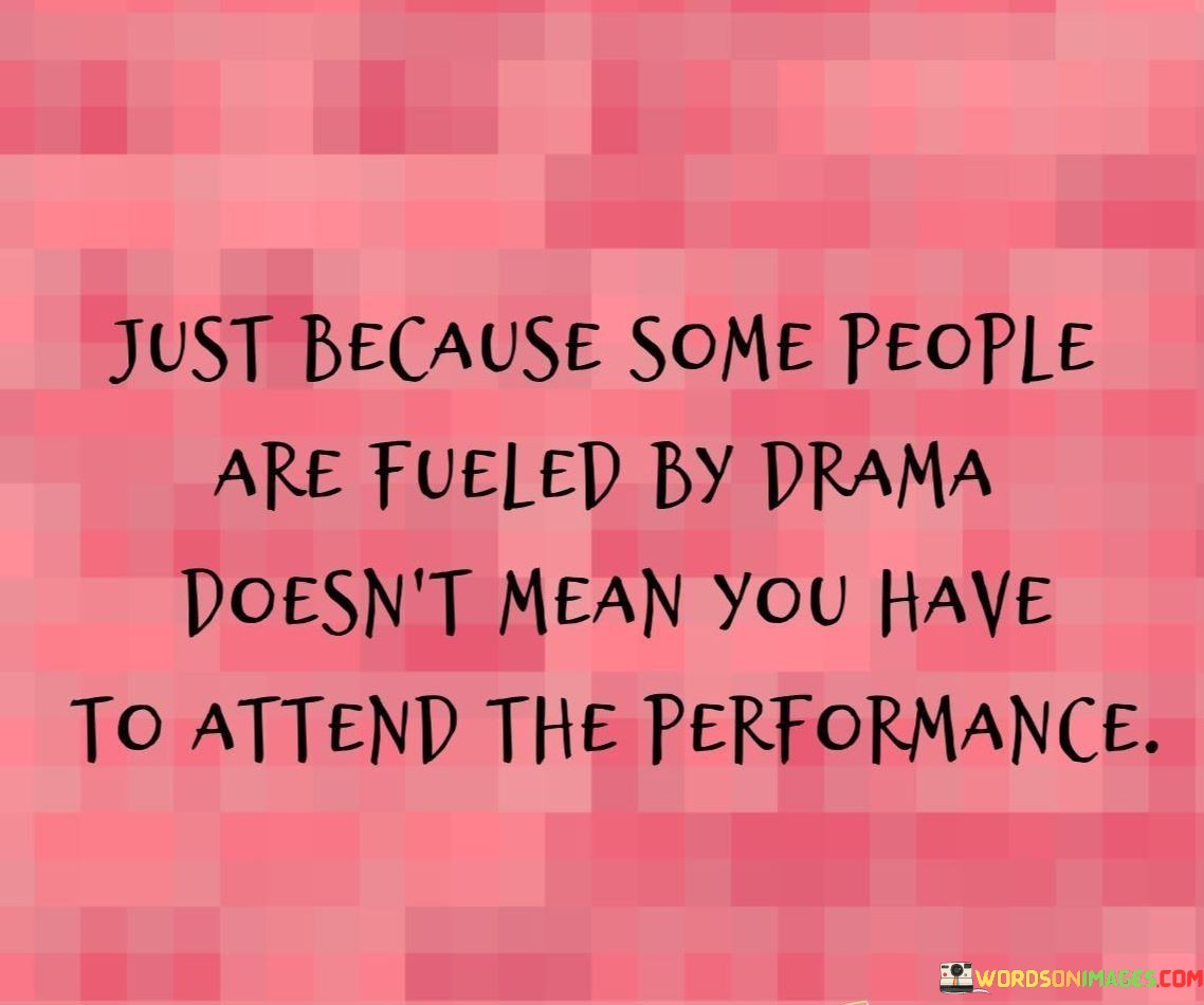 The quote "just because some people are fueled by drama doesn't mean you have to attend the performance" emphasizes the importance of setting healthy boundaries and choosing not to get entangled in unnecessary conflicts or negative situations. It suggests that some individuals thrive on drama and attention-seeking behavior, but we have the power to distance ourselves from such toxicity.