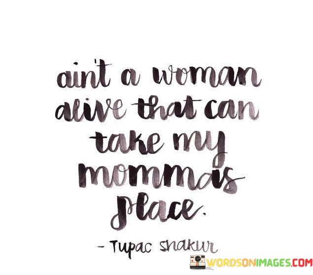 This poignant quote reflects the deep and irreplaceable bond between the speaker and their mother. It conveys a profound sense of love, admiration, and appreciation for the speaker's mother, acknowledging her unique and incomparable role in their life. The phrase acknowledges that no other woman can ever fill the void left by the speaker's mother, underscoring the special connection and influence she holds in their heart and soul.The use of the term "ain't" lends a sense of authenticity and raw emotion to the quote, emphasizing the speaker's strong conviction. It communicates the sentiment that there is no one else in the world who can match the love, care, and support that their mother provides.The quote is a tribute to the unconditional love and sacrifices that mothers often make for their children. It celebrates the immeasurable impact of a mother's presence and acknowledges the profound sense of loss that would be felt if she were to ever be absent. The quote serves as a universal recognition of the remarkable role that mothers play in the lives of their children, a role that cannot be replaced or replicated by anyone else.Overall, this heartfelt quote beautifully encapsulates the unique and unbreakable bond between a child and their mother. It speaks to the profound love and gratitude that the speaker holds for their mom, highlighting her unparalleled importance and influence in their life.