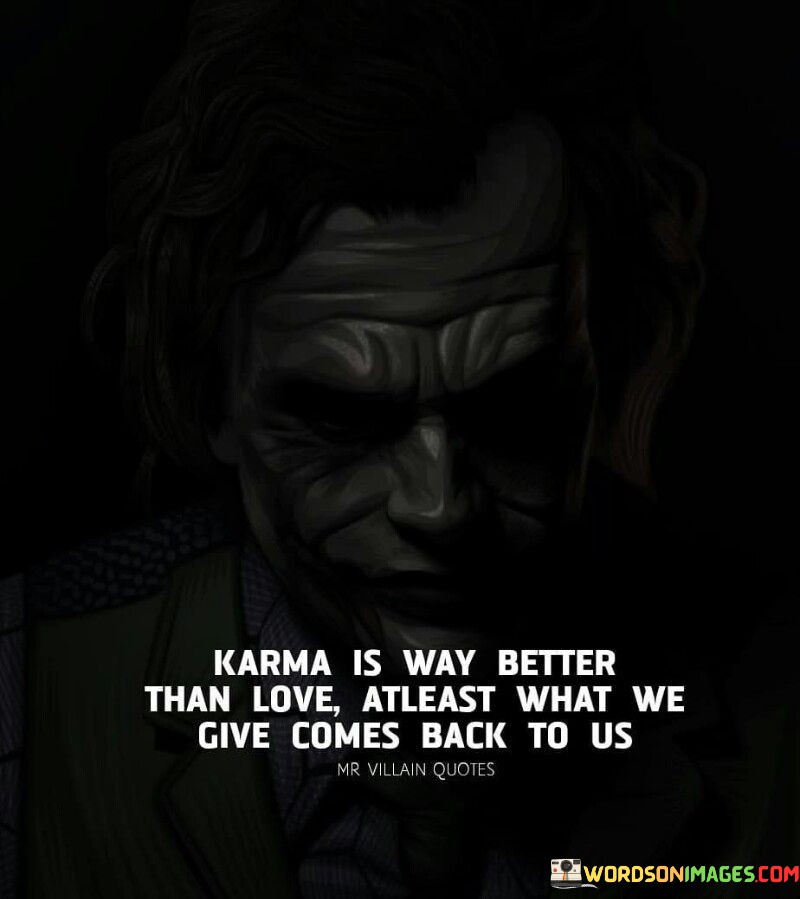 The quote compares karma and love in terms of reciprocity. It suggests that karma, the law of cause and effect, is superior to love because it ensures that what we give eventually returns to us. This perspective highlights the inherent fairness and balance in the concept of karma.