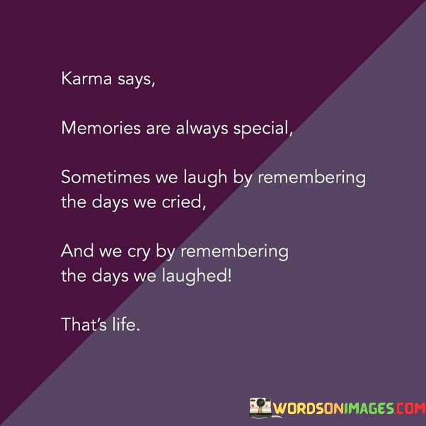 The quote reflects on the interconnectedness of memories, emotions, and the nature of life. In the first paragraph, it introduces the concept: "karma says memories are always special." This implies that memories hold significant value.