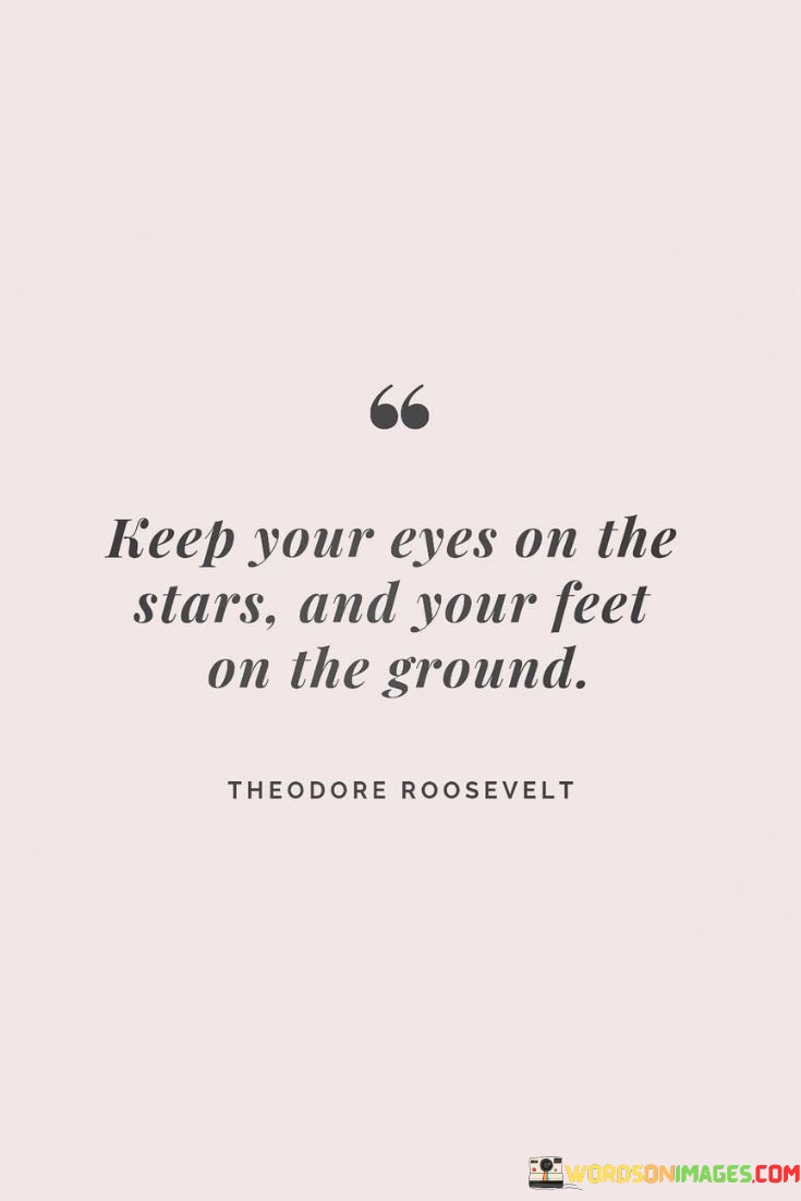 This quote encourages a balance between ambition and practicality. It suggests that while individuals should have lofty aspirations and set their sights on the stars, they should also remain grounded and connected to reality.