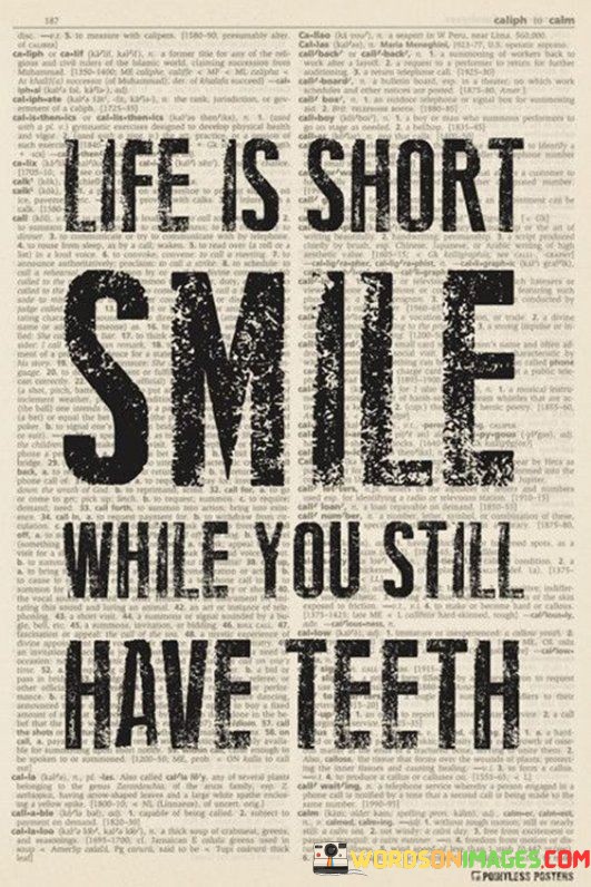 The quote suggests that life is fleeting and precious, and it encourages us to find joy and happiness in the limited time we have. The mention of "smile while you still have teeth" adds a playful touch, reminding us to make the most of our physical capabilities and opportunities for enjoyment.