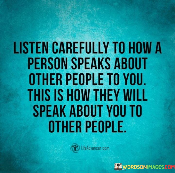 This quote emphasizes the importance of paying attention to how someone talks about others, as it can provide insights into how they may talk about you in your absence.