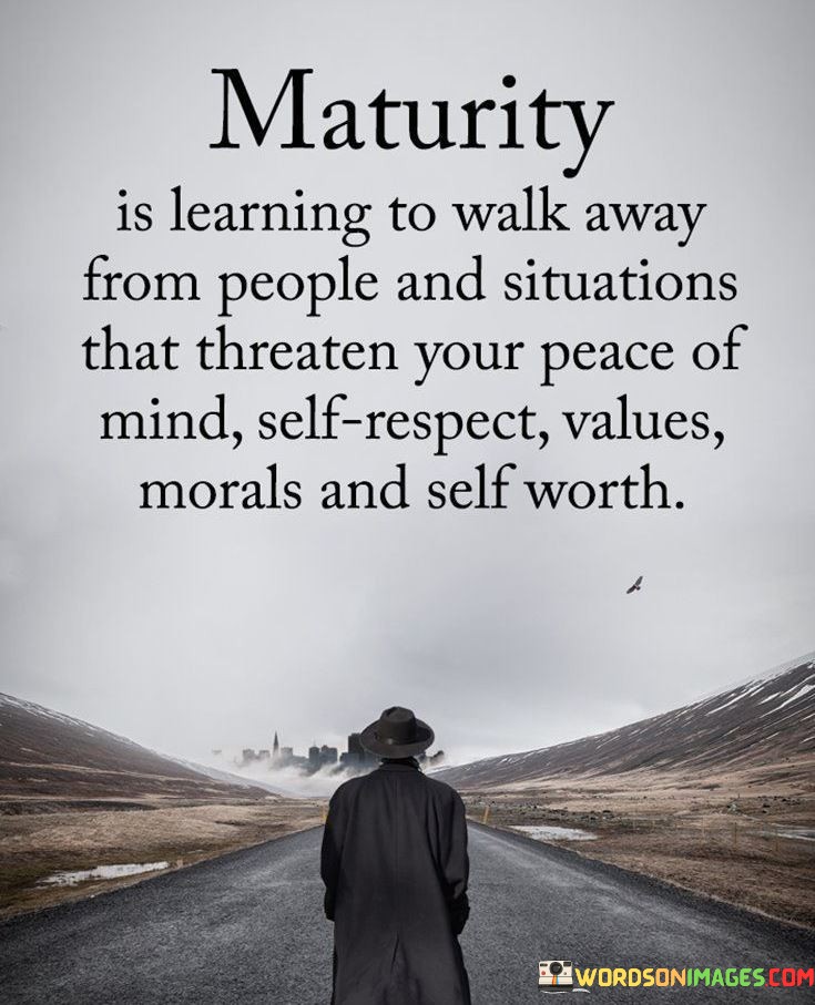 The quote underscores the idea that maturity involves recognizing when to disengage from people or situations that jeopardize one's well-being and core values. It signifies the importance of prioritizing peace of mind, self-respect, morals, and self-worth over toxic relationships or harmful circumstances.