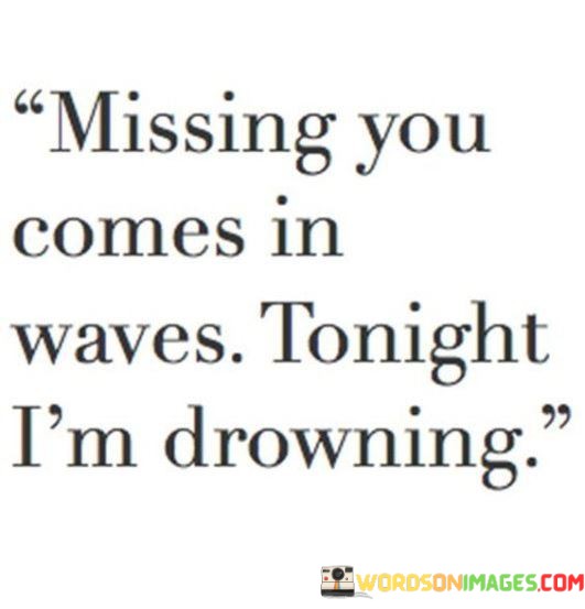 The quote encapsulates the unpredictable nature of grief and longing. "Missing you comes in waves" portrays the fluctuating intensity of the emotions tied to someone's absence. "Tonight I am drowning" vividly illustrates the overwhelming nature of the current wave, implying a temporary but intense struggle with the pain of loss.