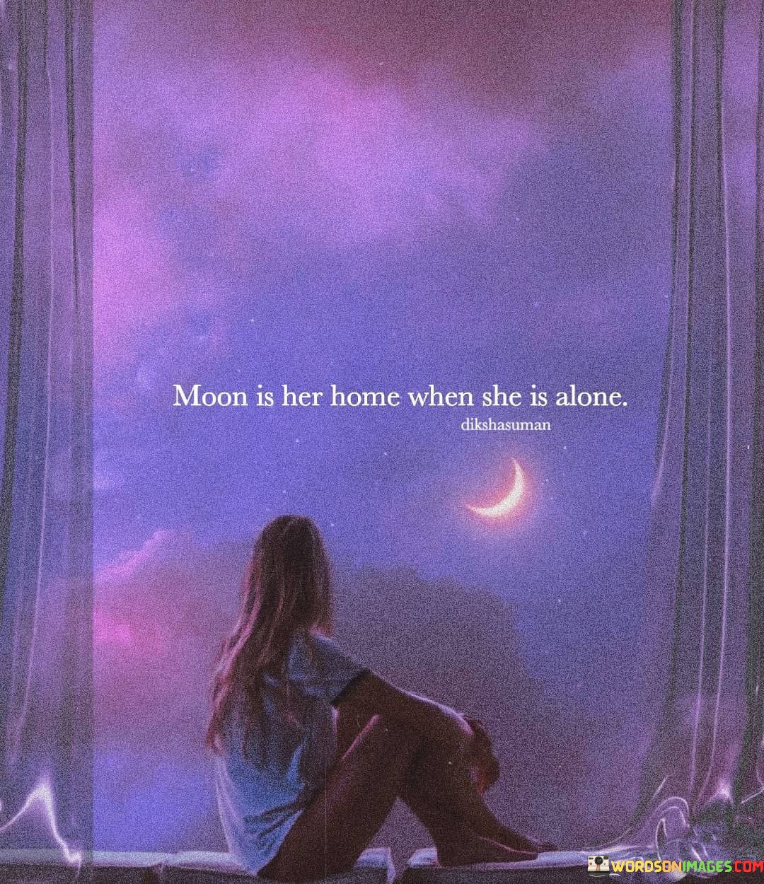 This evocative quote conveys a sense of solace and comfort found in solitude, symbolized by the moon. The phrase "moon is her home" suggests a deep connection to the moon, highlighting its significance as a source of companionship and tranquility when the person is alone. It implies that during moments of solitude, the moon becomes a comforting presence, providing a sense of belonging and understanding. The moon, with its gentle glow and unchanging presence, may represent a symbol of constancy and reassurance during times of isolation. The quote hints at the idea that finding solace in being alone is a source of strength and empowerment. It celebrates the notion of embracing solitude as a time for self-reflection, introspection, and inner peace. The quote may resonate with those who find comfort in the quietude of solitary moments, appreciating the celestial connection with the moon, which serves as a constant companion during such times. Ultimately, this quote serves as a poignant reminder of the value of finding contentment within oneself, embracing the beauty of solitude, and discovering the joy and peace that can be found when alone with the moon as a metaphorical home.