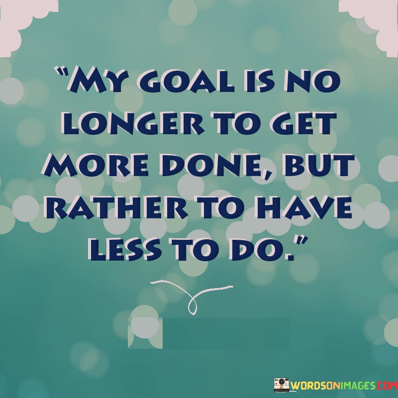 The quote expresses a shift in priorities from productivity to simplification. It suggests that the speaker's focus has transitioned from accomplishing numerous tasks to reducing their overall workload. In the first paragraph, the quote highlights the change in the speaker's approach to goals.