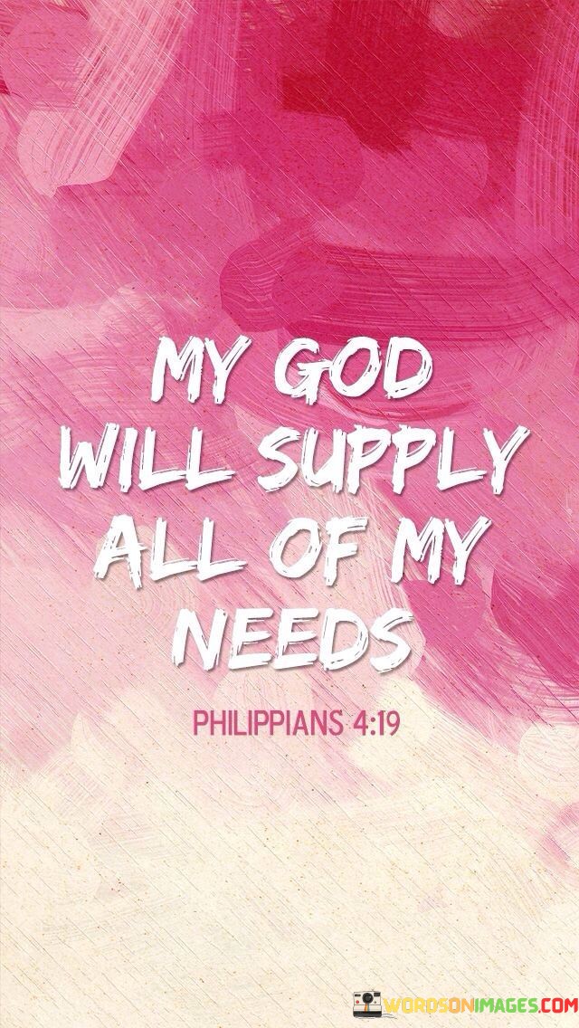 The statement "My God will supply" emphasizes the personal and intimate relationship between the individual and their faith in God. It conveys a sense of trust and reliance on a higher power for sustenance and support.