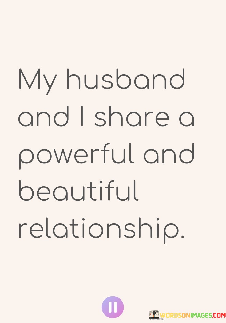 The statement "My husband and I share a powerful and beautiful relationship" is a positive affirmation of the strength, depth, and beauty of the bond between a married couple. It reflects a sense of love, connection, and mutual respect that exists between the two individuals.