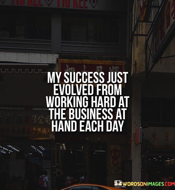 The statement "My Success Just Evolved From Working Hard at the Business at Hand Each Day" underscores the gradual development of success through consistent effort and dedication. It implies that meaningful achievements are the result of persistent work and focused attention on daily tasks.