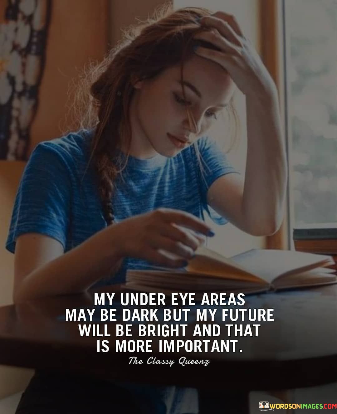 The statement suggests that while there might be temporary difficulties or imperfections, such as under-eye dark circles, the speaker remains focused on the promising future ahead. It emphasizes the value of looking beyond present setbacks and concentrating on long-term prospects.