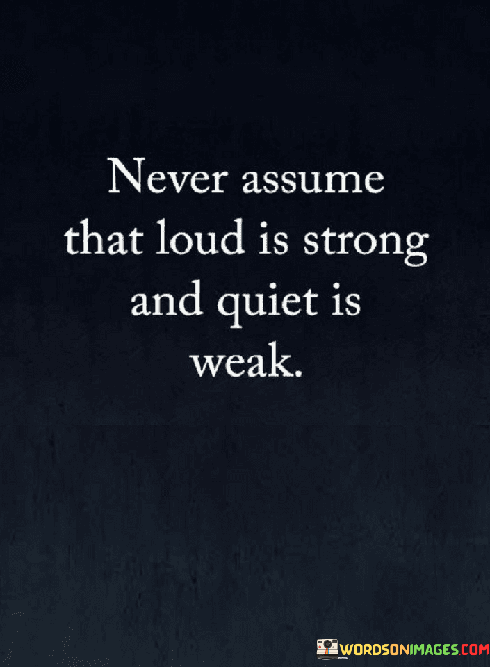 The quote challenges stereotypes and preconceptions. It advises against making judgments solely based on external appearances, emphasizing that volume doesn't necessarily equate to strength, and silence shouldn't be mistaken for weakness.