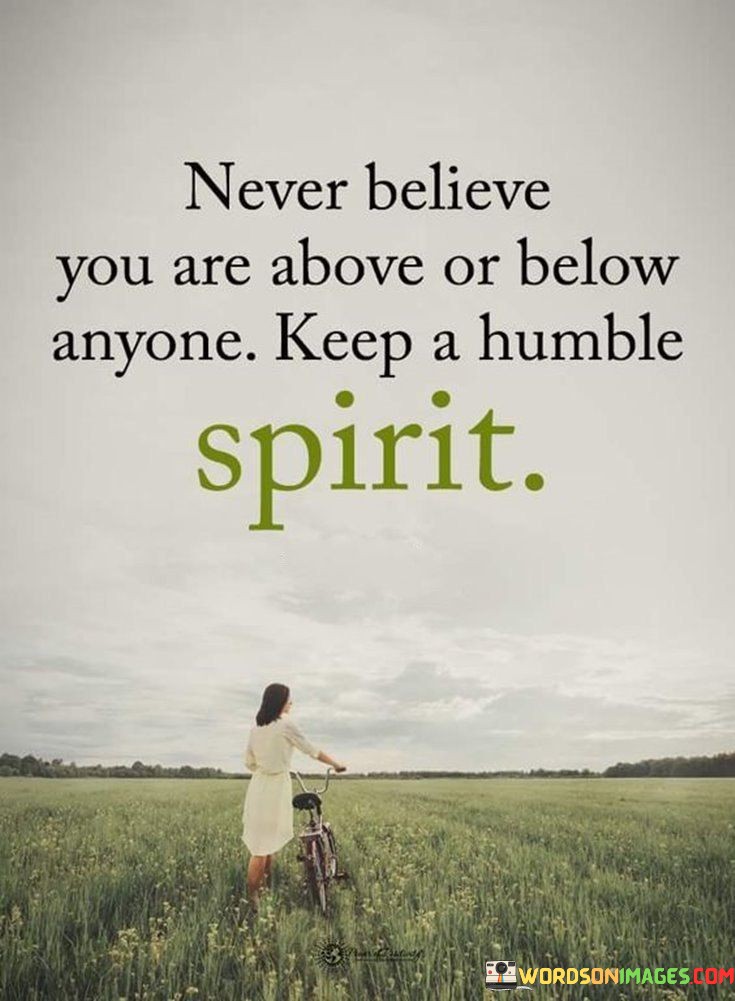 This quote is a reminder to maintain a sense of humility and equality in how we view ourselves and others. It's saying that we should never think of ourselves as superior (above) or inferior (below) to anyone else. Instead, we should always carry a humble attitude.