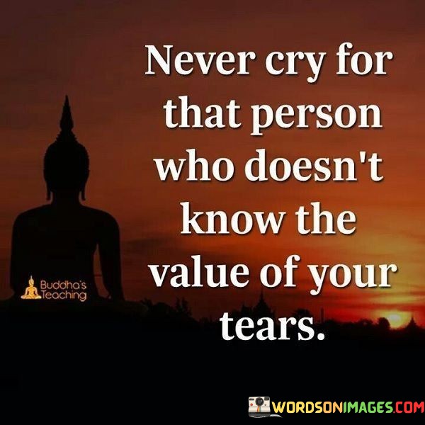 This quote conveys a message about the importance of recognizing the worth of one's emotions and not investing them in someone who doesn't appreciate or understand their significance. In the quote, it suggests that shedding tears for someone who doesn't acknowledge the value of those tears is a fruitless and potentially hurtful endeavor.