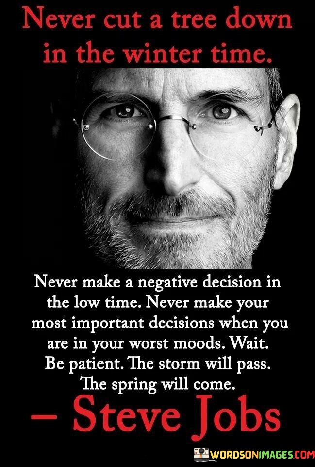 "Never make a negative decision in low time; never make your most important decision when you are in your worst moods. Wait, be patient, the storm will pass, and the spring will come," advises against making critical choices during moments of emotional turmoil.
