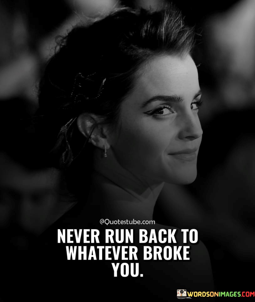 The quote speaks to the dangers of returning to situations that caused harm. It suggests that revisiting sources of pain or distress can be detrimental to one's well-being. This perspective highlights the importance of moving forward and not revisiting past experiences that led to brokenness.