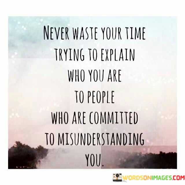 This statement advises against explaining oneself to those who won't understand. "Never Waste Your Time Trying to Explain Who You Are" underscores the futility of such efforts. "To People Who Are Committed to Misunderstanding You" points out the unyielding nature of their perspective.