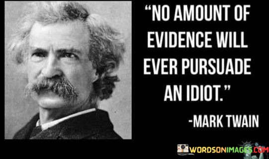 This quote humorously points out that some individuals are so closed-minded or stubborn that no amount of evidence or reasoning will change their views. "No amount of evidence will ever persuade an idiot" humorously suggests that people with strong, irrational beliefs may remain resistant to logical arguments and evidence.
