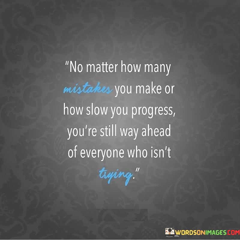 The quote "No matter how many mistakes you make or how slow you progress, you're still way ahead of everyone who isn't trying" highlights the significance of perseverance and effort in one's journey towards success. It serves as a powerful reminder that taking action and striving for improvement, no matter how small the steps may seem, sets individuals apart from those who remain stagnant or reluctant to pursue their dreams.
