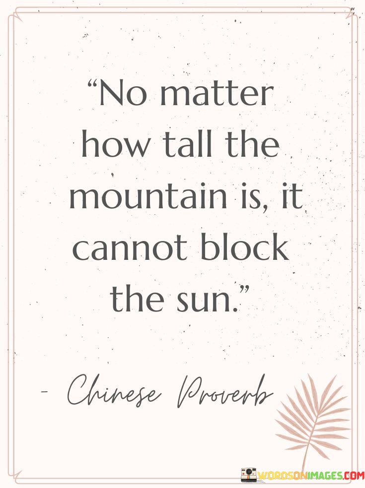 "No matter how tall the mountain is, it cannot block the sun" is a quote that symbolizes the resilience and unstoppable nature of positivity and light, even in the face of challenges or obstacles.